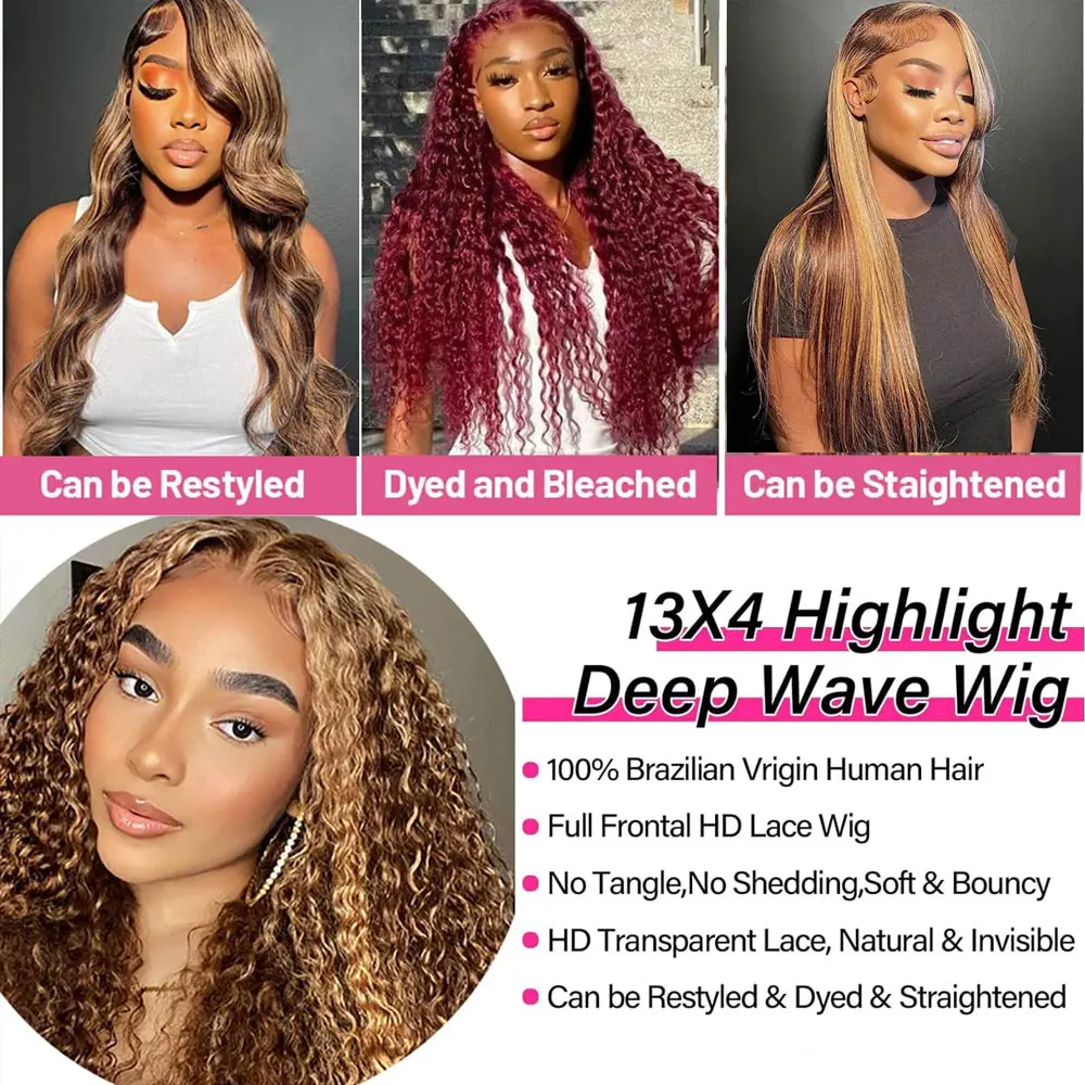 Highlight Curly Wig 13×4 Lace Front Wig Human Hair Wigs Glueless HD Deep Wave Lace Frontal Wig 4/27 Colored Wigs PrePlucked