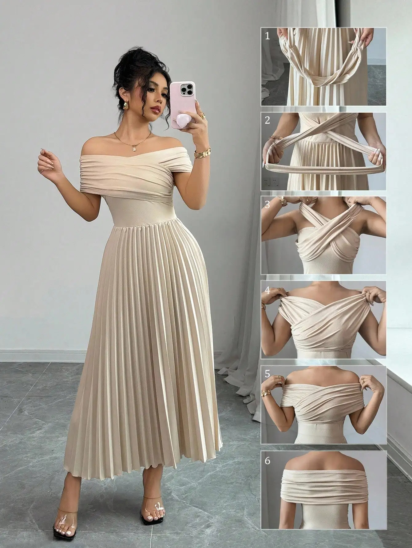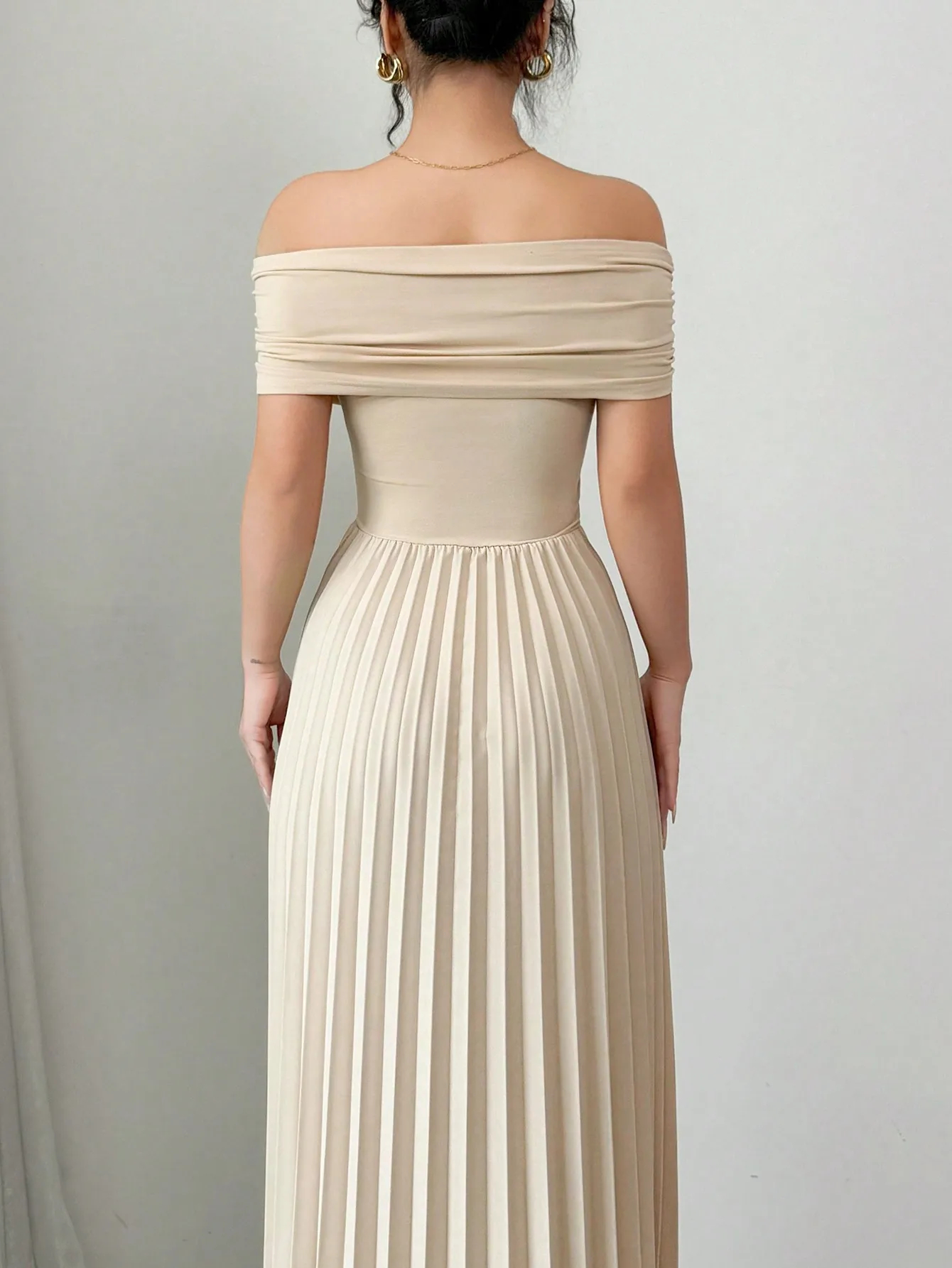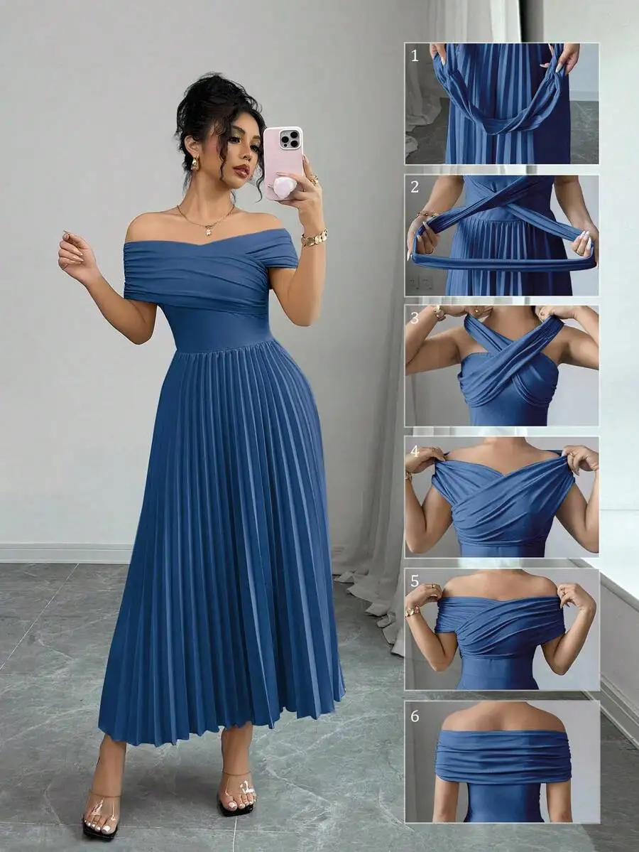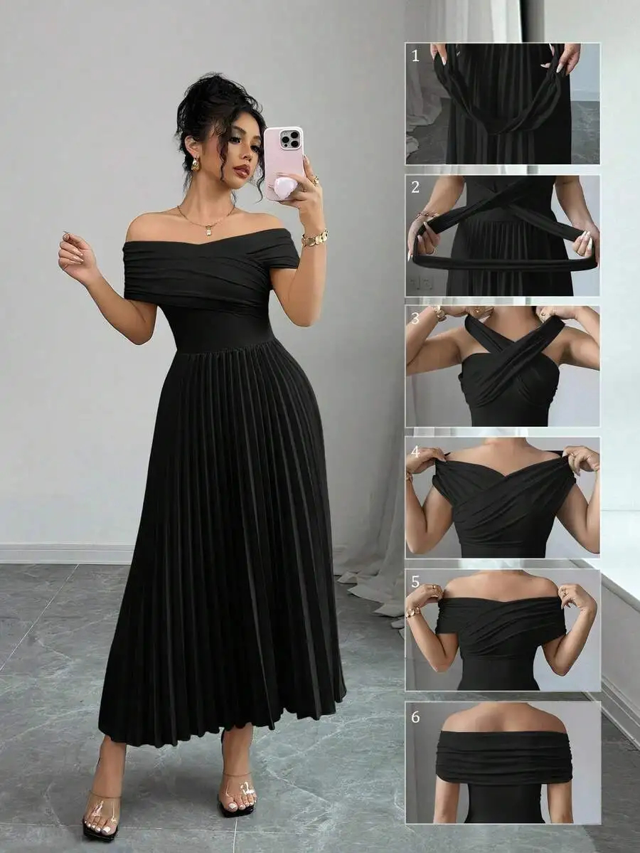 Be the first to review “Off Shoulder Pleated Maxi Dress with Adjustable Wrap Top”